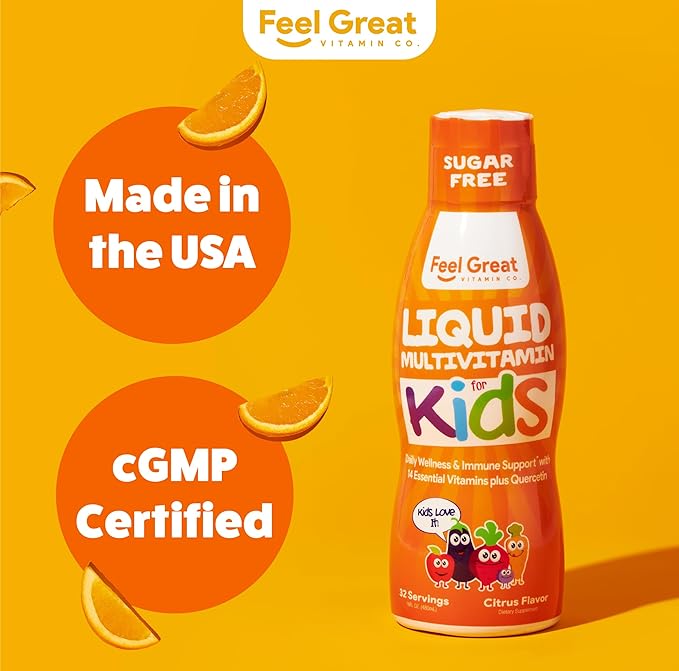 Feel Great Sugar Free Kids Multivitamin – Liquid Multivitamin | Essential Vitamins for Immune Support | Orange Flavored, Vegetarian Formula | 30 Day Supply