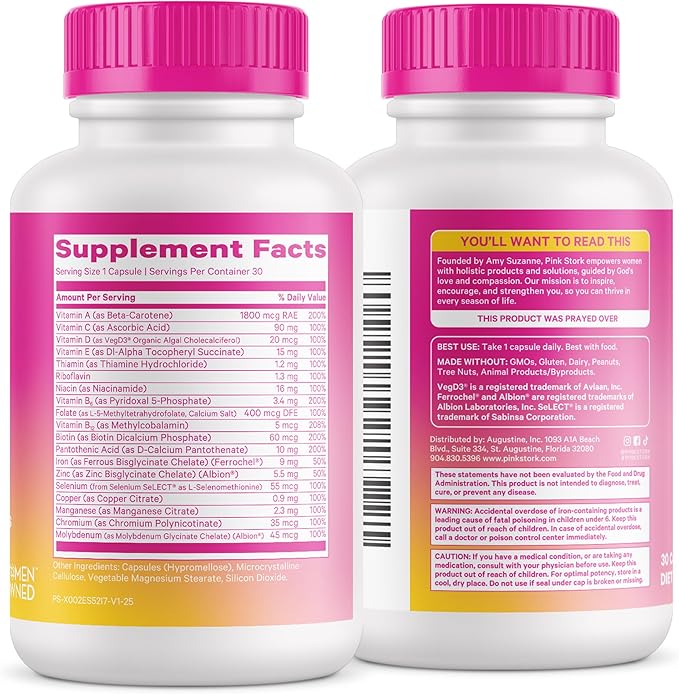 - 1. Complete Daily Wellness Support Meet your body’s daily nutritional needs with Pink Stork Total Women’s Multivitamin — a powerhouse formula delivering 100%+ daily value of 17 essential vitamins and minerals. Crafted for adult women, this multivitamin supports immune health, energy levels, metabolism, and overall vitality. Whether you’re balancing a busy schedule or nurturing your well-being long-term, this all-in-one supplement is your foundation for consistent health.