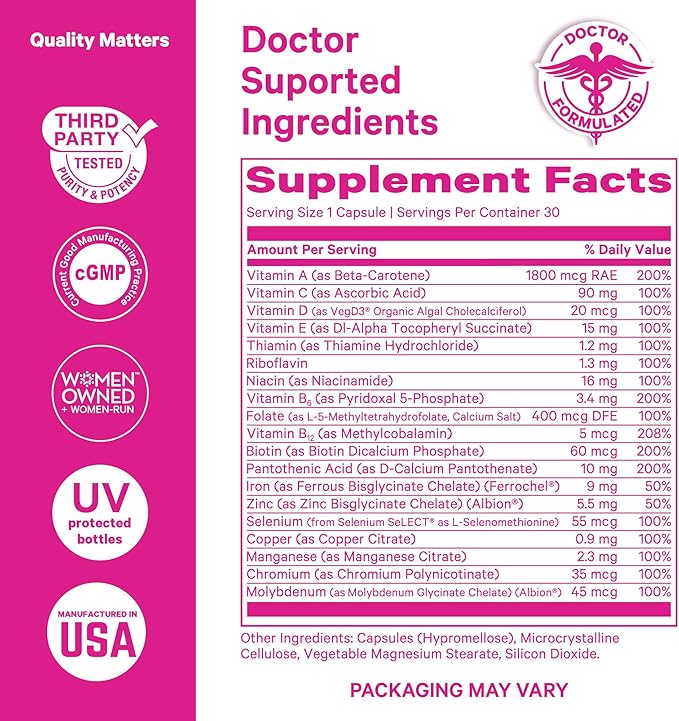 - The Total Package for Women's Health: This women's multi is the total package designed for adult women of all ages and stages! Get 100% of your daily B-complex vitamins for energy, metabolism, and cognitive function. Plus, extra Vitamins A and E for cellular health, Vitamins C and D for immune and mood support, Biotin for hair and skin health, and key minerals like Iron, Zinc, and Chromium for overall women's wellness.