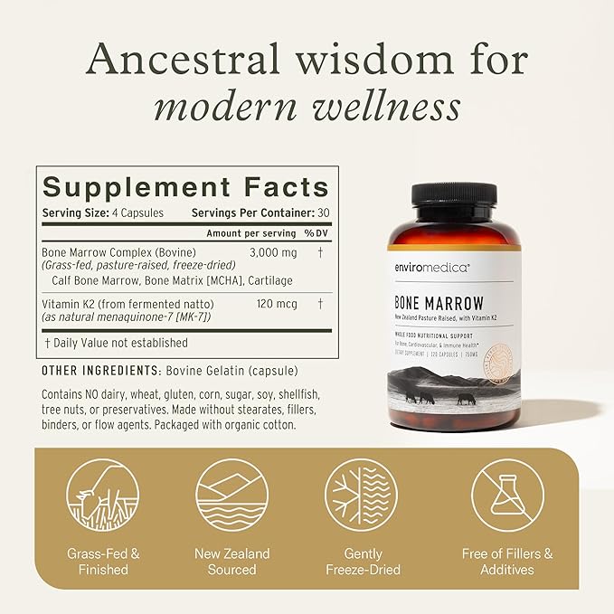 Enviromedica Bone Marrow Supplement – Grass-Fed New Zealand Beef Bone Marrow, MCHA, Bovine Cartilage, Collagen, Freeze-Dried, Vitamin K2 MK7, 120 Capsules