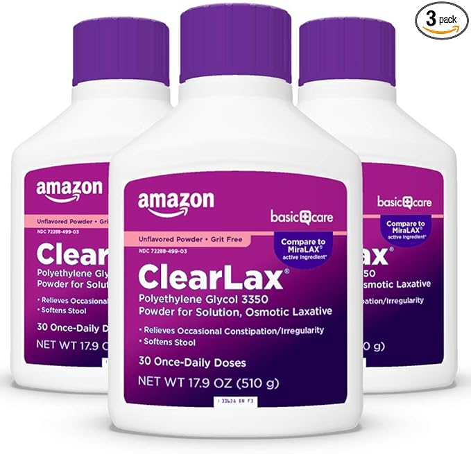 Amazon Basic Care ClearLax, Polyethylene Glycol 3350 Powder for Solution, Osmotic Laxative, Unflavored, 1.11 pound (Pack of 3)