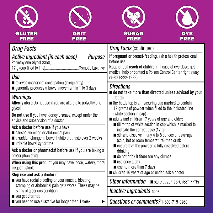 - UNFLAVORED POWDER: Unflavored laxative powder dissolves in any beverage. Grit free, sugar free and gluten free. For adults and children 17 years of age and older.