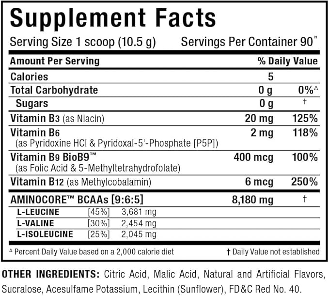 - RAPID RECOVERY AND REDUCED MUSCLE SORENESS: Packed with 8.18 grams of pharmaceutical-grade BCAAs per serving, AMINOCORE quickly promotes muscle repair, reduces breakdown, and ensures faster recovery, helping you consistently perform at your peak.