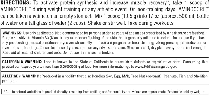 - RAPID RECOVERY AND REDUCED MUSCLE SORENESS: Packed with 8.18 grams of pharmaceutical-grade BCAAs per serving, AMINOCORE quickly promotes muscle repair, reduces breakdown, and ensures faster recovery, helping you consistently perform at your peak.