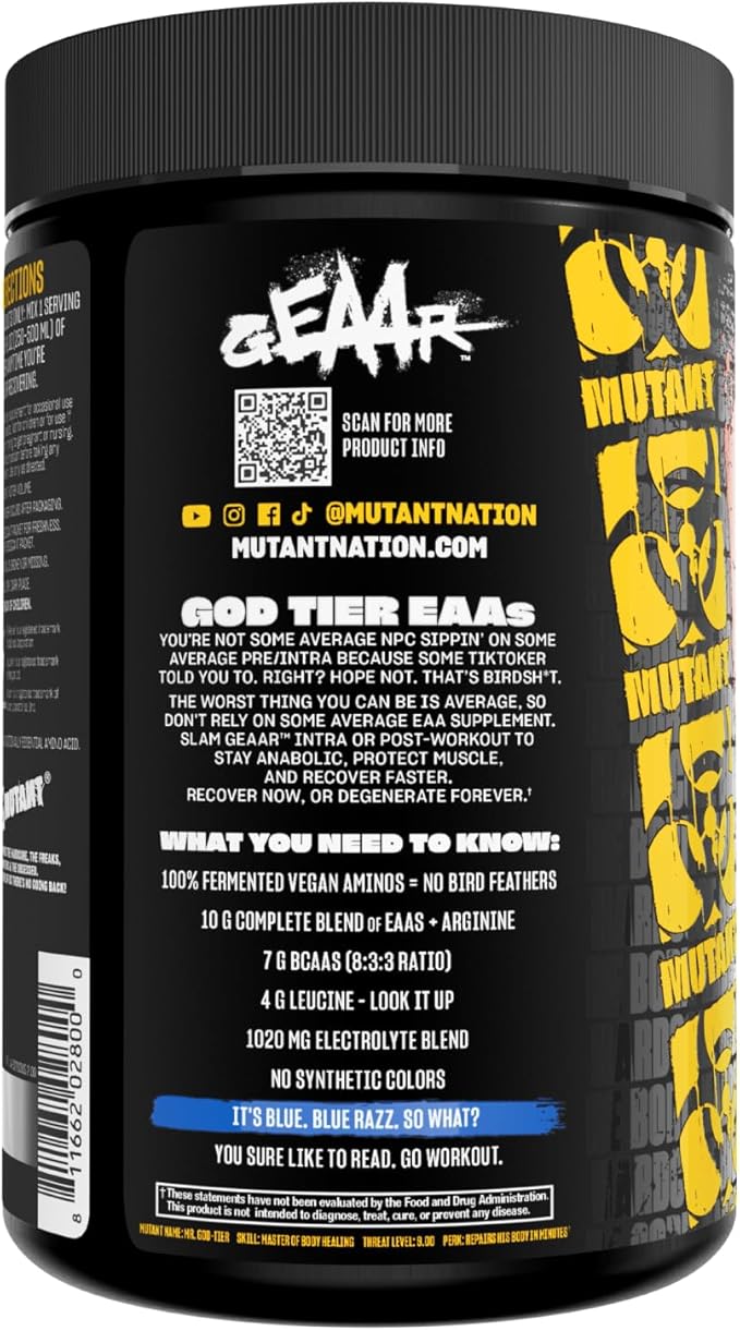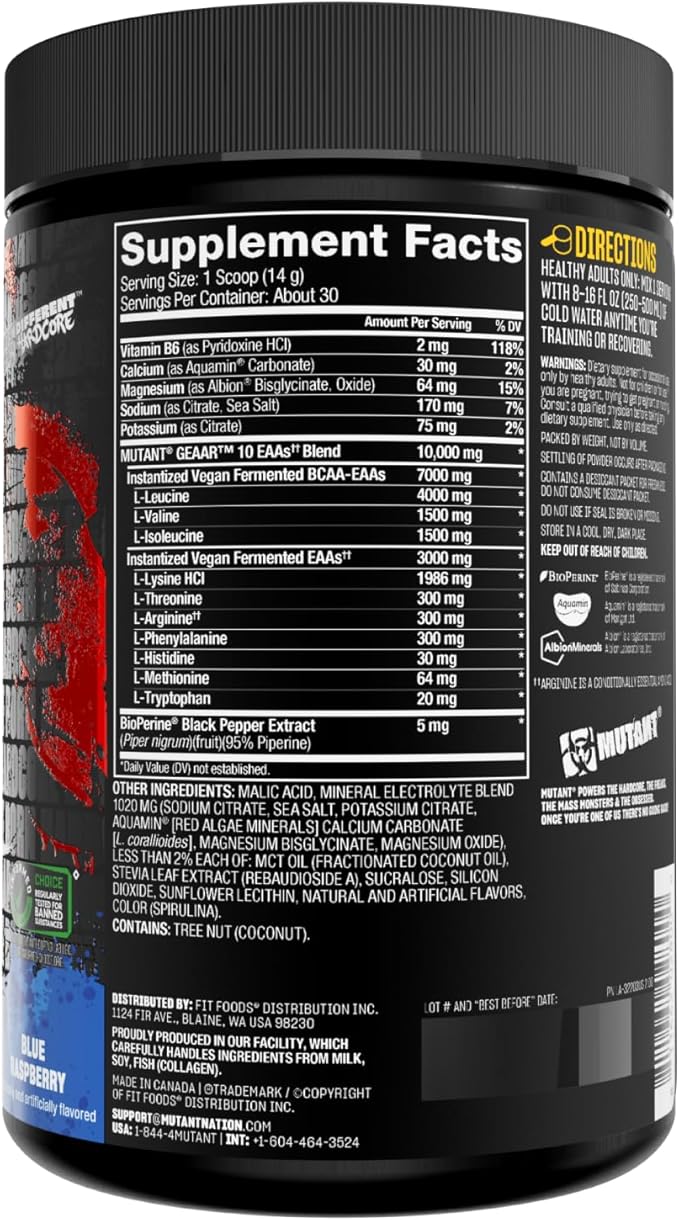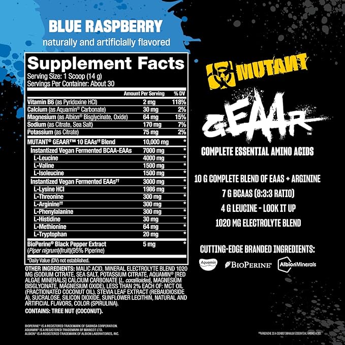 Mutant GEAAR - 9.4g of EAA Powder + Arginine, 7g BCAAs, 4g Leucine, Electrolytes, Coconut Water, 30 Servings - Blue Raspberry