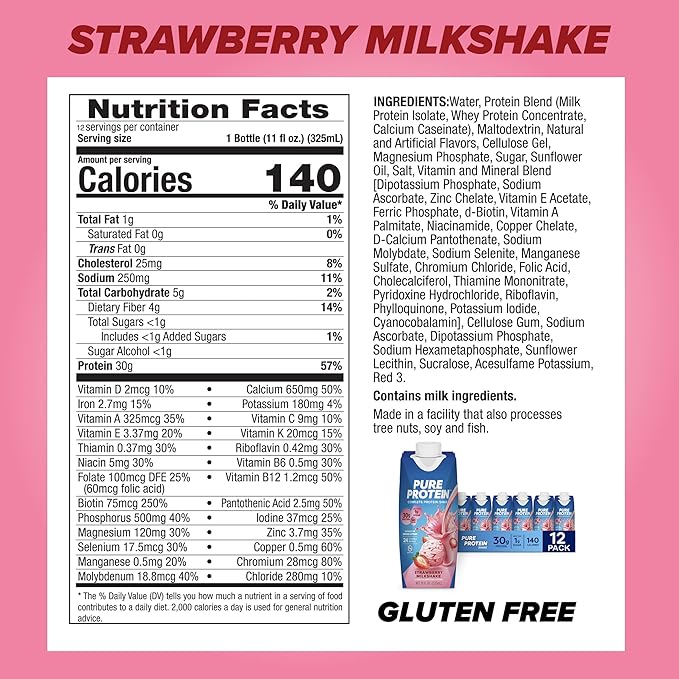 Pure Protein Strawberry Protein Shake, 30g Complete Protein, Ready to Drink and Keto-Friendly, Vitamins A, C, D, and E plus Zinc to Support Immune Health, 11oz Bottles, 12 Pack