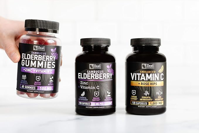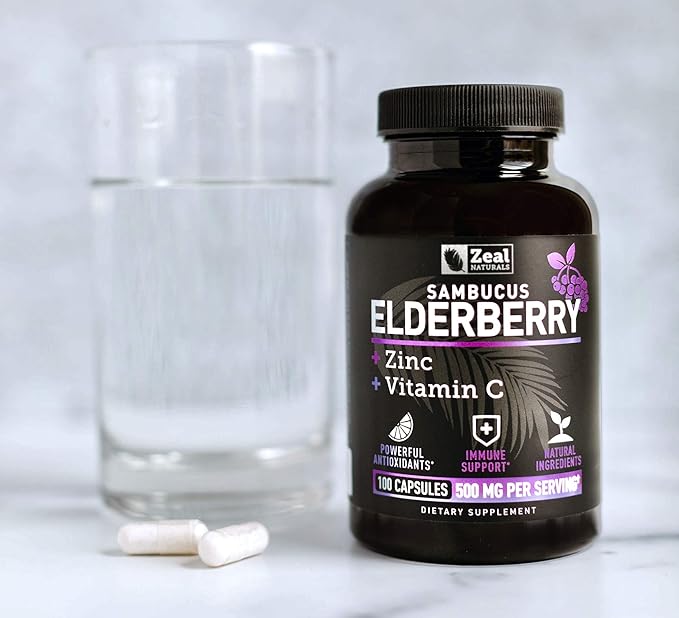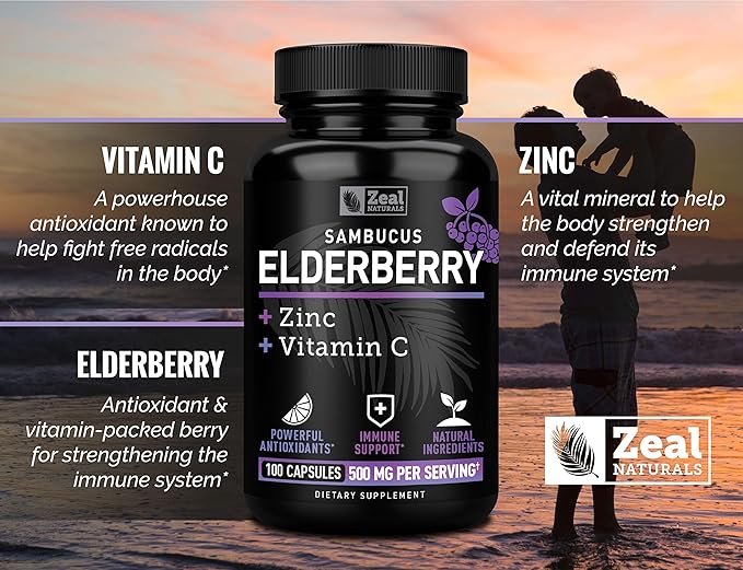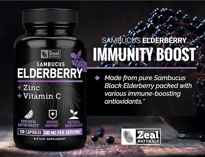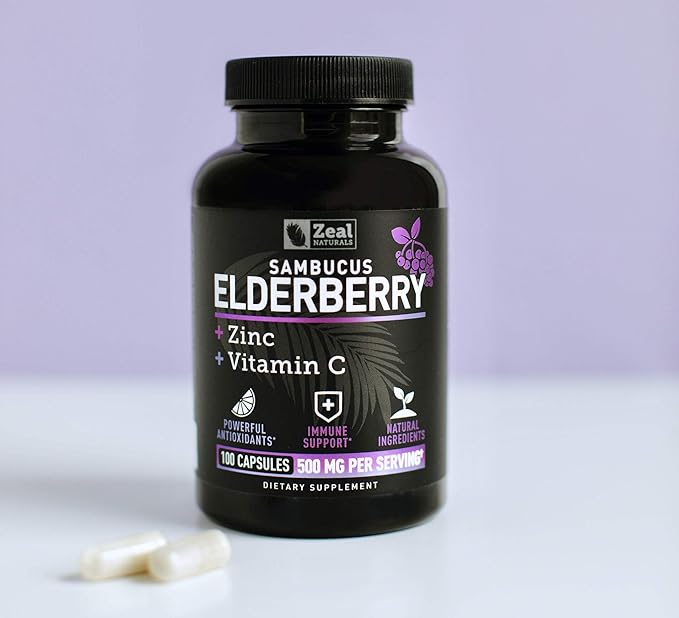 Zeal Naturals Max Strength Elderberry Capsules + Zinc + Vitamin C | 500mg for Immune System Support with Black Sambucus Elderberry | 100 Count | 3-in-1 Immune Support for Adults