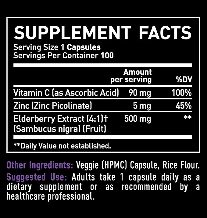 - Maximum strength formula. Formulated for maximum immune boosting properties with 100% daily value of Vitamin C, 45% Zinc, and 500mg of Sambucus Black Elderberry extract.*
