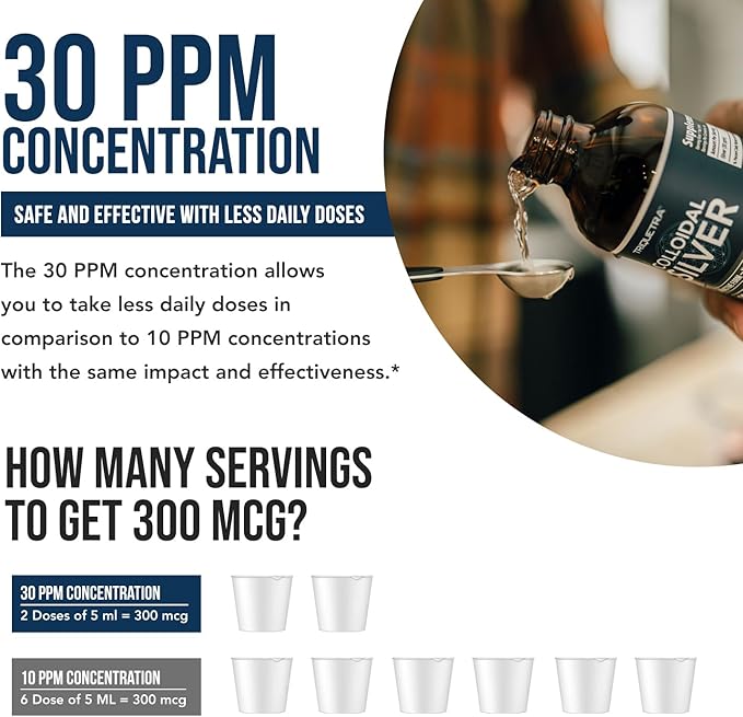 - 30 PPM CONCENTRATION = LESS DOSES & 100% SAFE: Take less daily doses with 30 PPM concentration. Unlike 10 PPM concentrations, which require 5-7 servings per day. Our 30 PPM concentration allows for 100% safe and effective doses only 2 times a day. Based on the EPA’s reference dose, you could safely take our silver 2 times daily for 70 years.*