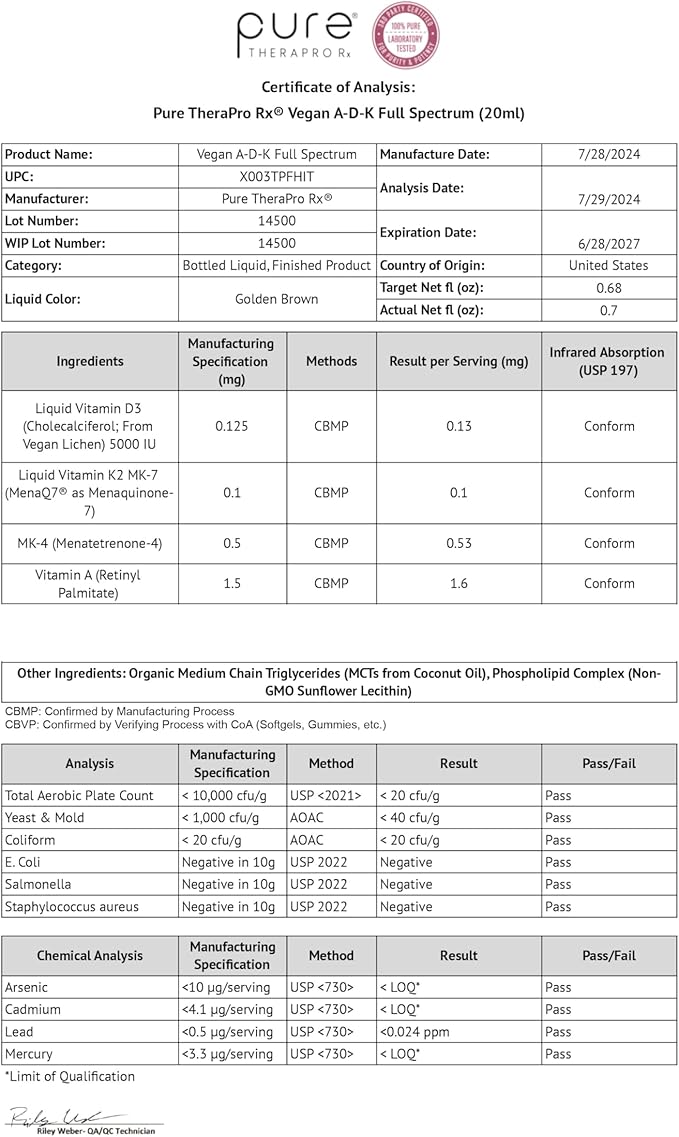 Pure TheraPro Rx Vegan A-D-K Drops-6 Mon Supply-Vitamin A(Palmitate & Betacarotene),Liposomal Vitamin D3(as vegan cholecalciferol),Liposomal Vitamin K2(MK-4 & MK-7)Supports Immunity & Bone Health-20mL