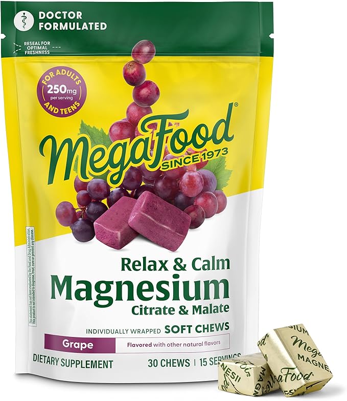 - DOCTOR FORMULATED MAGNESIUM SUPPORT: MegaFood Relax + Calm Magnesium Grape Soft Chews help relax the body, promote a sense of calm, and may ease muscle tension; Delicious Grape flavor; 250 mg of Magnesium per serving+