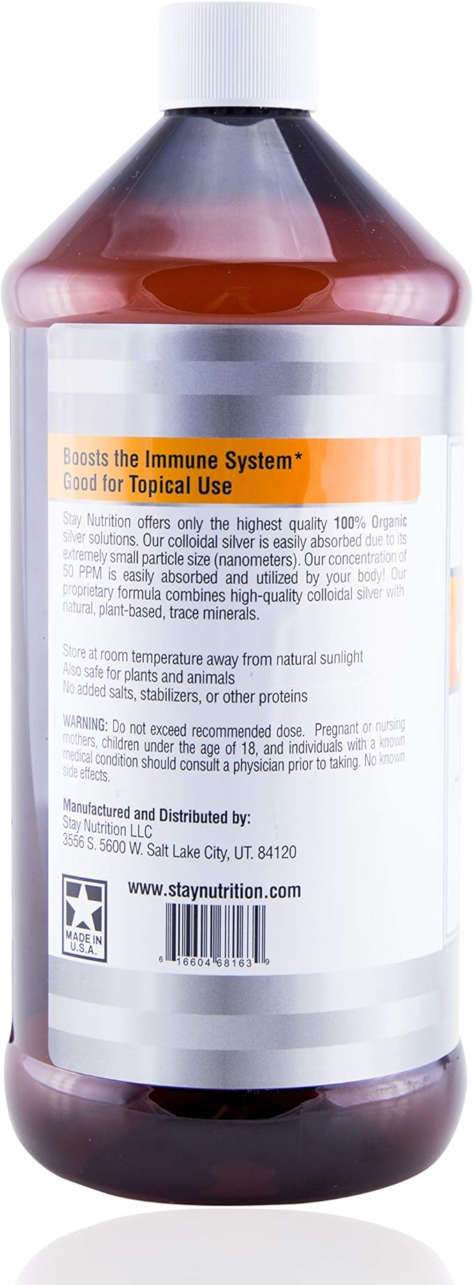 - PROUDLY MADE IN USA: Stay Nutrition premium colloidal ionized silver is the purest and most effective choice for supporting your vigor and vitality. Our vegan, allergen-free, gluten-free, and GMO-free bioactive silver is made with the highest-quality ingredients and manufactured in state-of-the-art facilities in the USA. If you have any questions or concerns about our silver supplement liquid, please don't hesitate to contact us. We are here to help!
