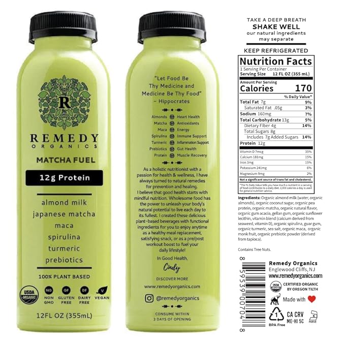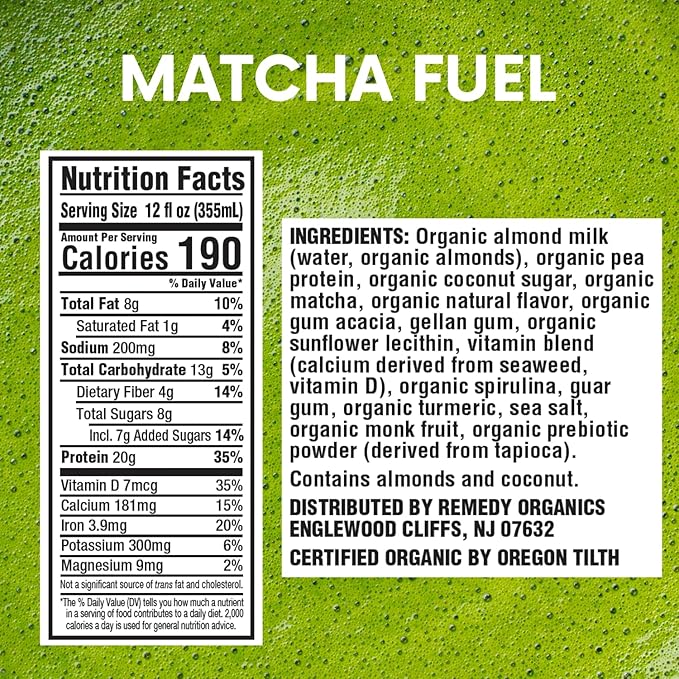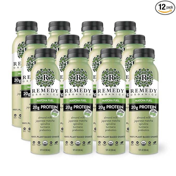 Remedy Organics Matcha Fuel 12-Pack | Plant Based Protein Shakes, Ready to Drink | USDA Organic, Gluten Free, Dairy Free, Soy Free