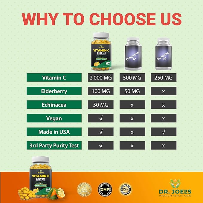 Dr. JOEL'S Immune Support Vitamin C 2000 mg - 200 Tablets - with Zinc, Elderberry, Rose Hip, Echinacea - Boosts Immune System- Made in USA