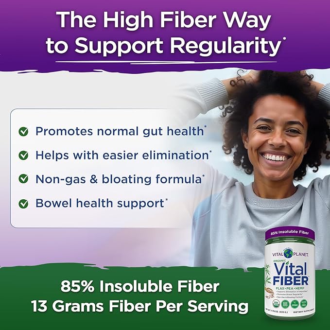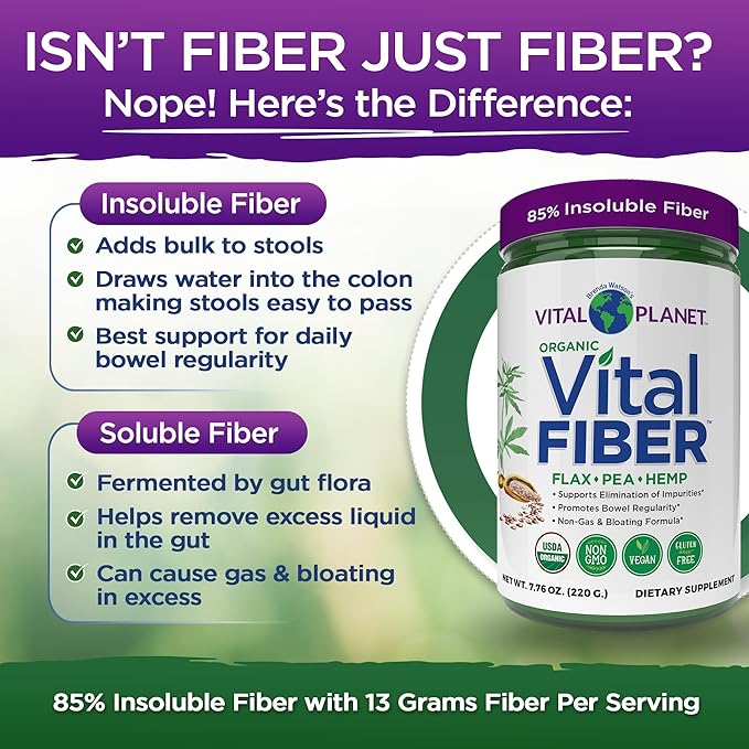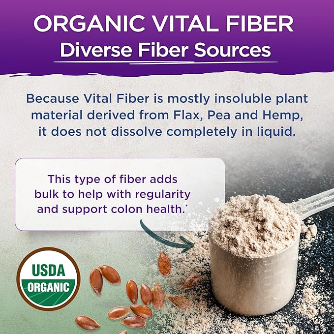 - Fiber for Regularity - Organic Vital Fiber is the daily fiber designed specifically to support bowel regularity. This unique, high-fiber supplement is made from organic pea, flaxseed, and hemp fiber plus key gut-focused herbs - fennel seed, slippery elm, marshmallow root, and triphala fruit. It contains a specific ratio of 85% insoluble to 15% soluble fiber. Insoluble fiber adds bulk to stools while it draws water into the colon making stools soft and easier to pass.
