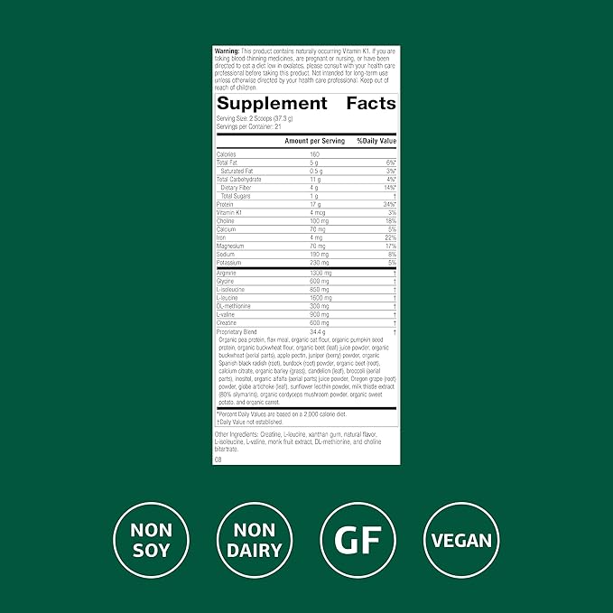 - Protein Powder Supplement: An excellent source of protein as it contains 17 g per serving from pea isolates, pumpkin concentrate, oat flour, and buckwheat flour; provides amino acids required for conjugation enzymes (phase II enzymes)*