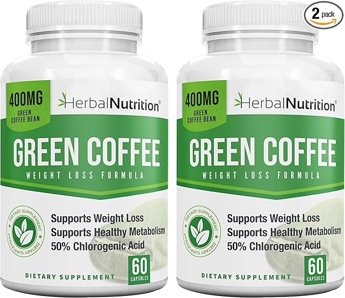 Herbal Nutrition BOGO Pure Green Coffee Bean Extract, Two Bottle Pack, 120 Capsules, Multi-Level Dosing 400mg - 1200mg Per Serving, 50% Chlorogenic Acid. Weight Loss & Cleanse Supplement