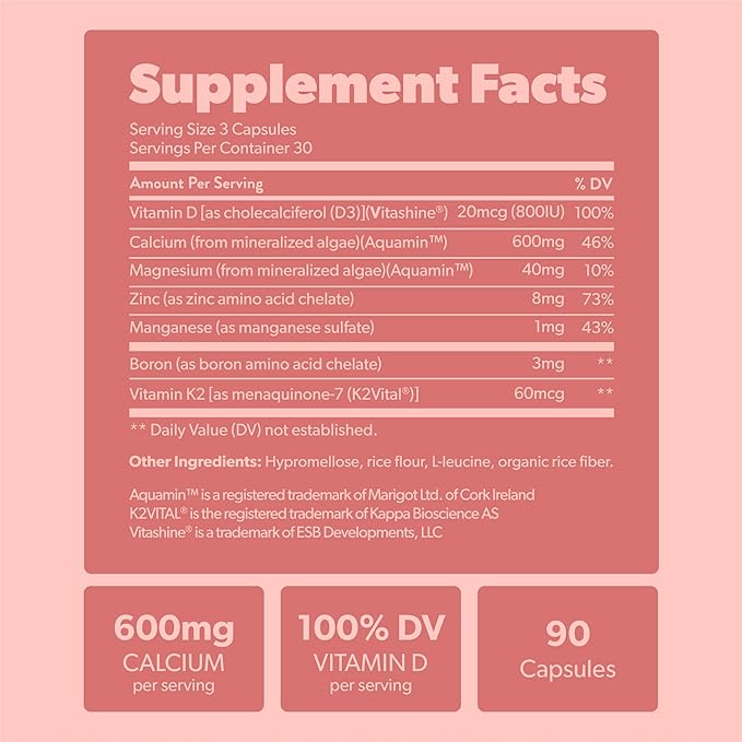 - All-In-One Formula - Our Vegan Calcium is packed with 600mg of Elemental Calcium from sustainably sourced Red Algae. Contains Vitamin K2 and D3, Zinc, Manganese, and Boron.