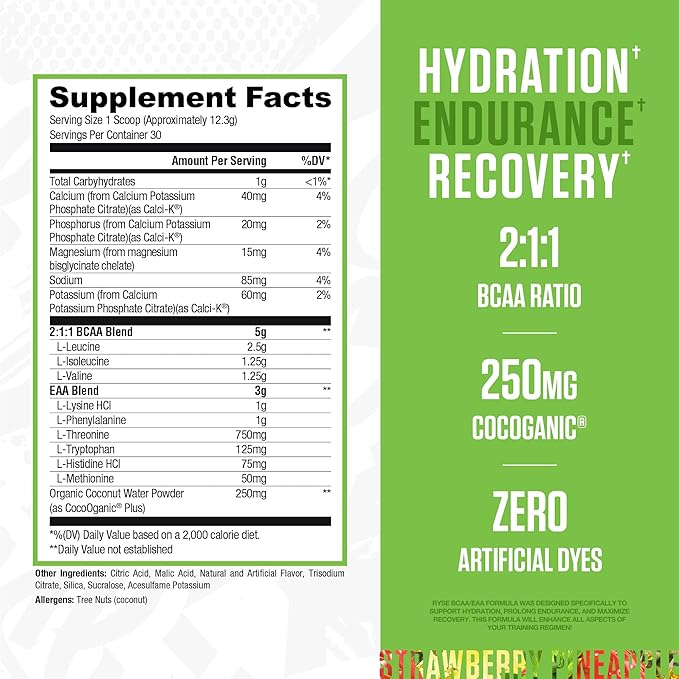 RYSE BCAA EAA Powder - Strawberry Pineapple - 5g Branched Chain Amino Acids, 3g Essential Aminos, Sugar-Free Electrolytes for Pre & Post Workout Muscle Recovery, Hydration and Strength - 30 Servings