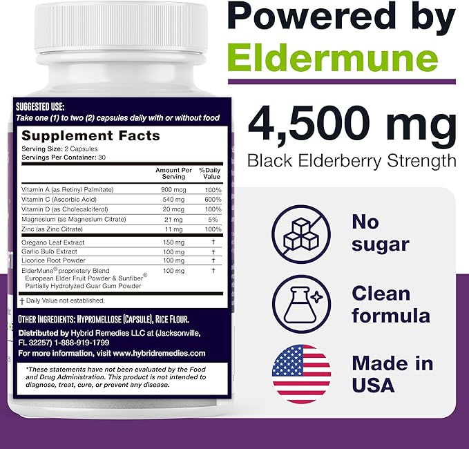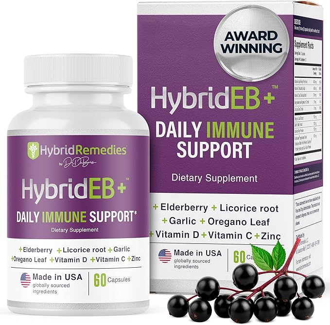 - Complete Elderberry Immune System Booster: HybridEB combines premium Elderberry extract with Zinc, Magnesium, Vitamins C & D3, Garlic, Oregano, and Licorice for year-round immune support for kids and the entire family.