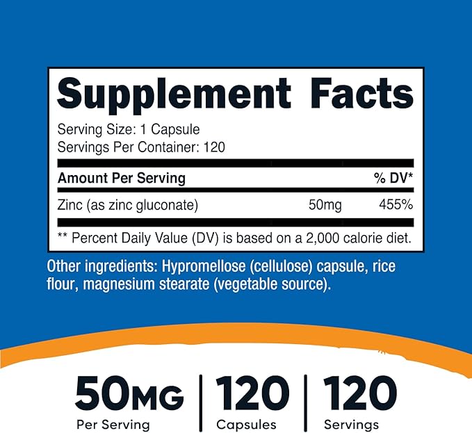 - 50mg of Zinc (from Zinc Gluconate) Per Capsule