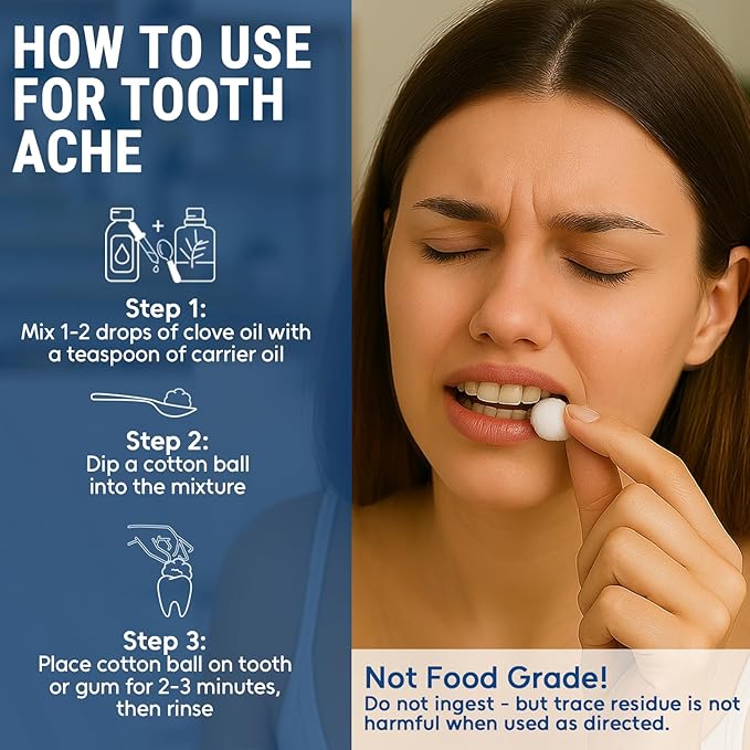 - Tooth & Gum Comfort (External Use Only): When diluted, natural clove oil can be applied to gums or teeth to soothe discomfort. Leave for 2–5 minutes, then rinse. Not food grade - do not ingest - but trace residue is not harmful when used as directed.