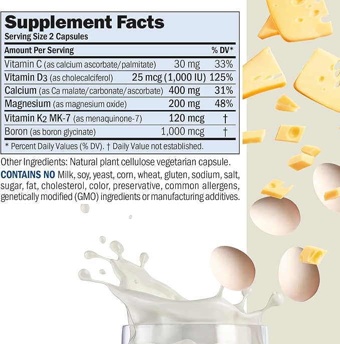 - Superior, Pure Bio-Active Ingredients - Delivers Calcium, Magnesium, Vitamin C, Vitamin D, Vitamin K2 MK-7 and Boron. Contains no Milk / Dairy-Free, Gluten-Free; no soy, yeast, wheat, sodium, salt, sugar, fat, cholesterol, color, preservative, common allergens or manufacturing additives.