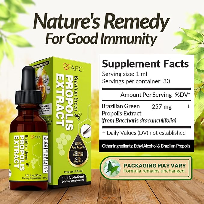 - PREMIUM QUALITY BRAZILIAN GREEN PROPOLIS EXTRACT: AFC Brazilian Green Propolis is 100% collected from Brazil Minas Gerais, away from industrial or agricultural pollution. This region is home to a unique plant species (Baccharis dracunculifolia) which produces the best grade of bees propolis with the highest level of flavonoids and Artepillin-C. Extracts of Brazilian green bee propolis helps to support immunity health.