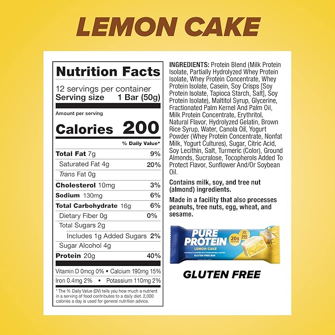 - DELICIOUS HIGH PROTEIN BAR: Pure Protein Lemon Cake Bars are full of flavor and contain 20g of protein for lasting energy. Each delicious bar is gluten free with high-quality protein that helps build lean muscle and strength.
