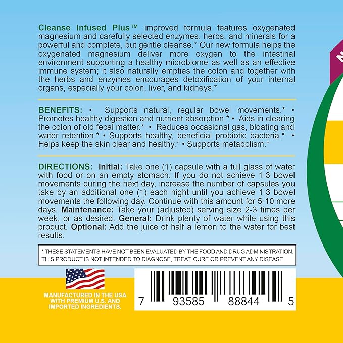 - OXYGENATED MAGNESIUM: The key ingredient in "Cleanse Infused" is oxygenated magnesium, which releases atomic oxygen that oxidizes waste in your gut, making it soft. It gently cleanses the colon of waste and toxic build-up, promoting great health and relieving constipation.