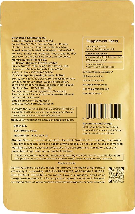 CARMEL ORGANICS Organic Ashwagandha Root Powder (8 Oz or 227g/0.5 Lbs) USDA Certified. Lab Tested, Non GMO & Gluten Free | Withania Somnifera from India
