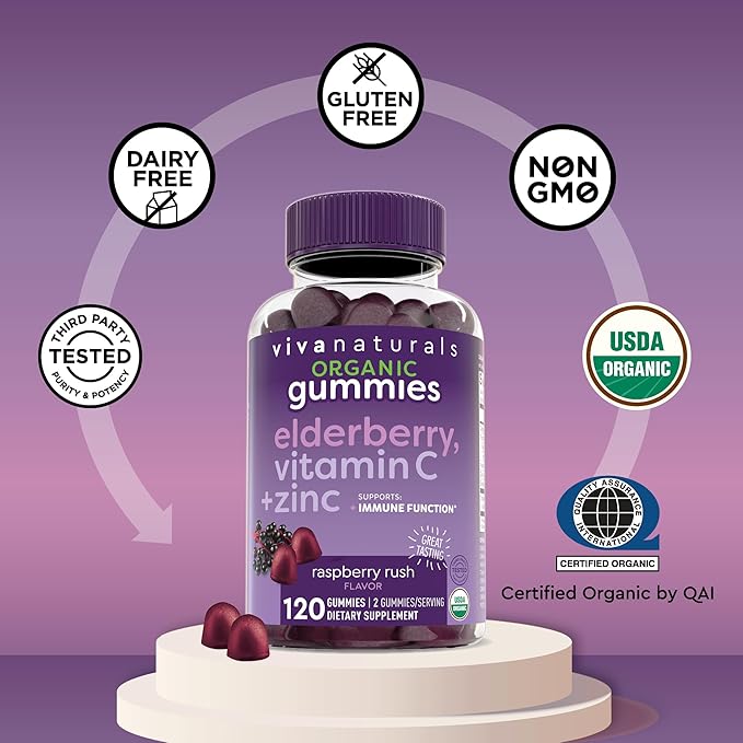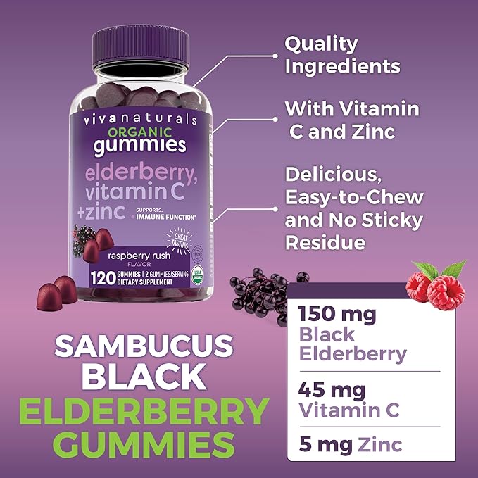 Viva Naturals Organic Sambucus Elderberry Gummies for Adults (120 Count) - 3in1 Black Elderberry Vitamin C and Zinc Immune Support Gummies, Chewable Elderberry Supplements, Zinc Immunity Gummies
