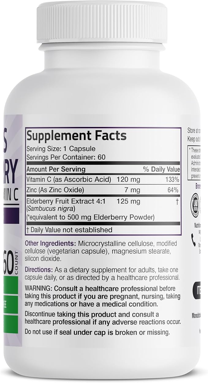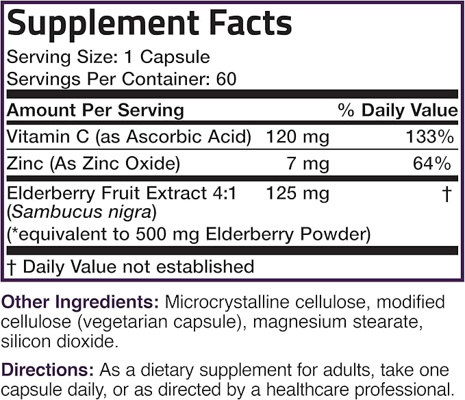 - Key Daily Replenishment: Combining Sambucus Elderberry with Vitamin C as Ascorbic Acid and Zinc to provide antioxidant protection and promote daily replenishment of key nutrients.* Supplying 500 mg of Elderberry, 7 mg of Zinc, and 120 mg of Vitamin C per vegetarian capsule.