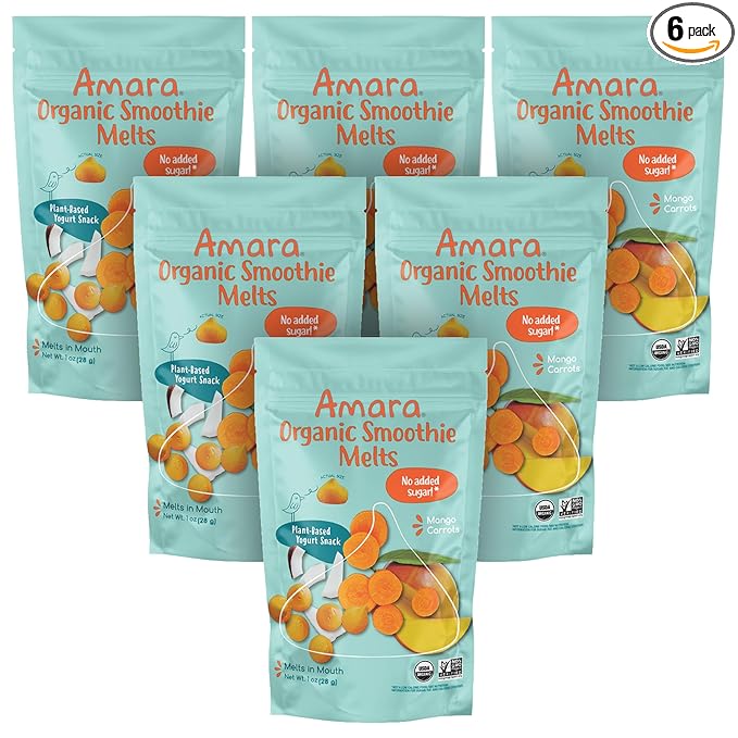 - NO ADDED SUGAR: Amara delivers nutritious baby food and snacks that are 100% organic and non-GMO. The first melt-in-mouth snack without any added sugar or fillers, these melts keep little hands busy and tiny tummies full without the sugar crash.