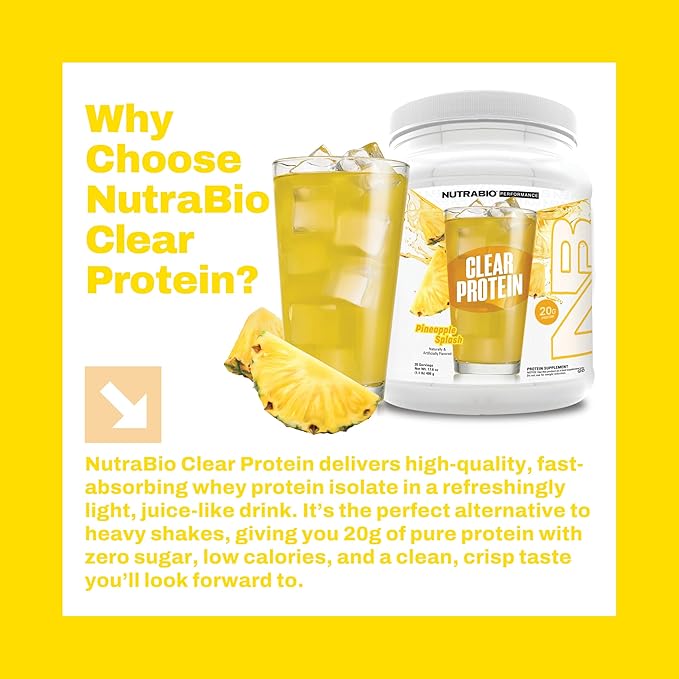 NutraBio Clear Protein Powder, Pineapple Splash - 20 Servings, 20g Clear Whey Protein Isolate, 0 Sugar, 0g Lactose, Refreshing Fruit Flavors, GLP1 Support - Bone Health - Muscle Post Workout Recovery
