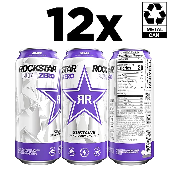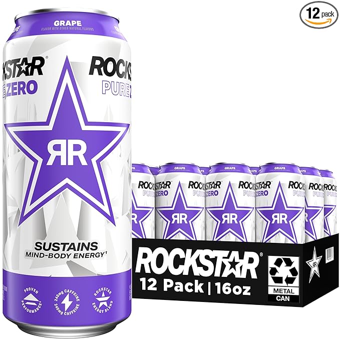 - Includes 12 (16oz) cans of Rockstar Energy Drink, Pure Zero Grape