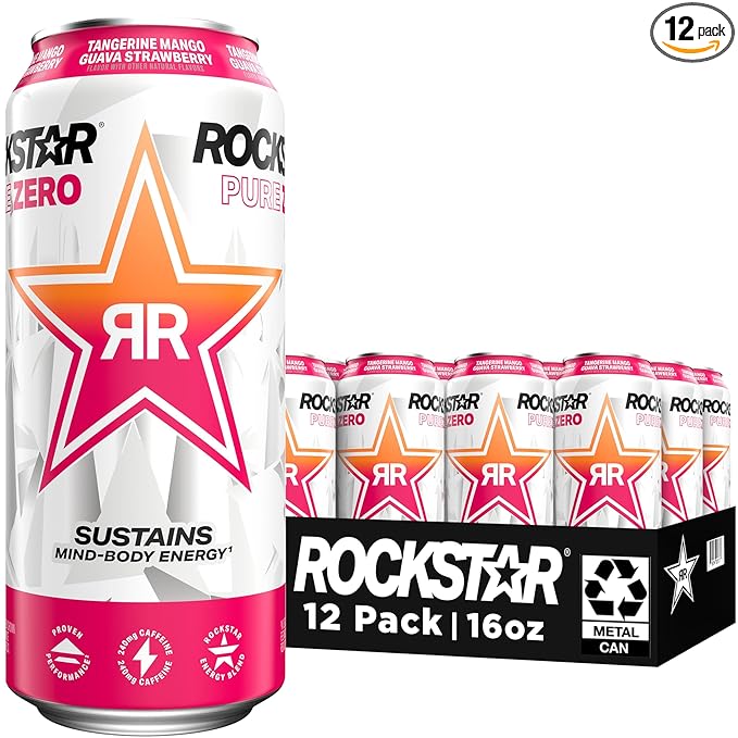 Rockstar Pure Zero Energy Drink, Tangerine Mango Guava Strawberryh, 0 Sugar, with Caffeine and Taurine, 16 Fl Oz (Pack of 12) (Packaging May Vary)