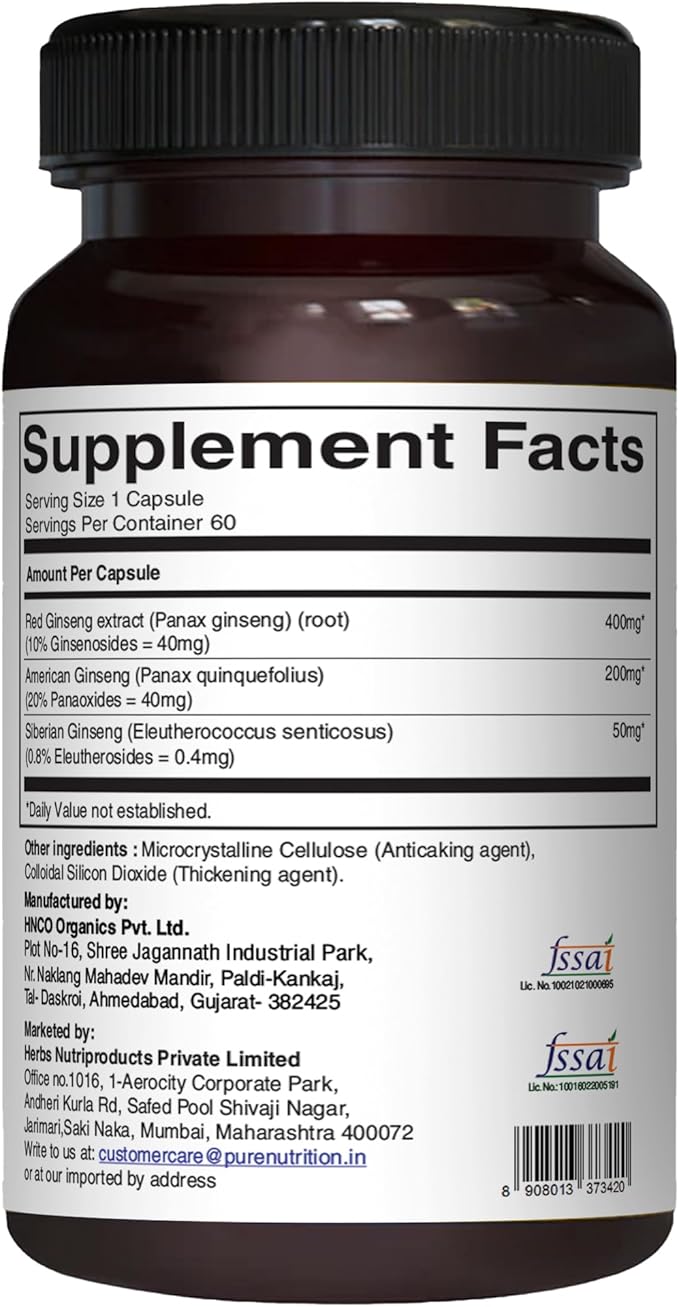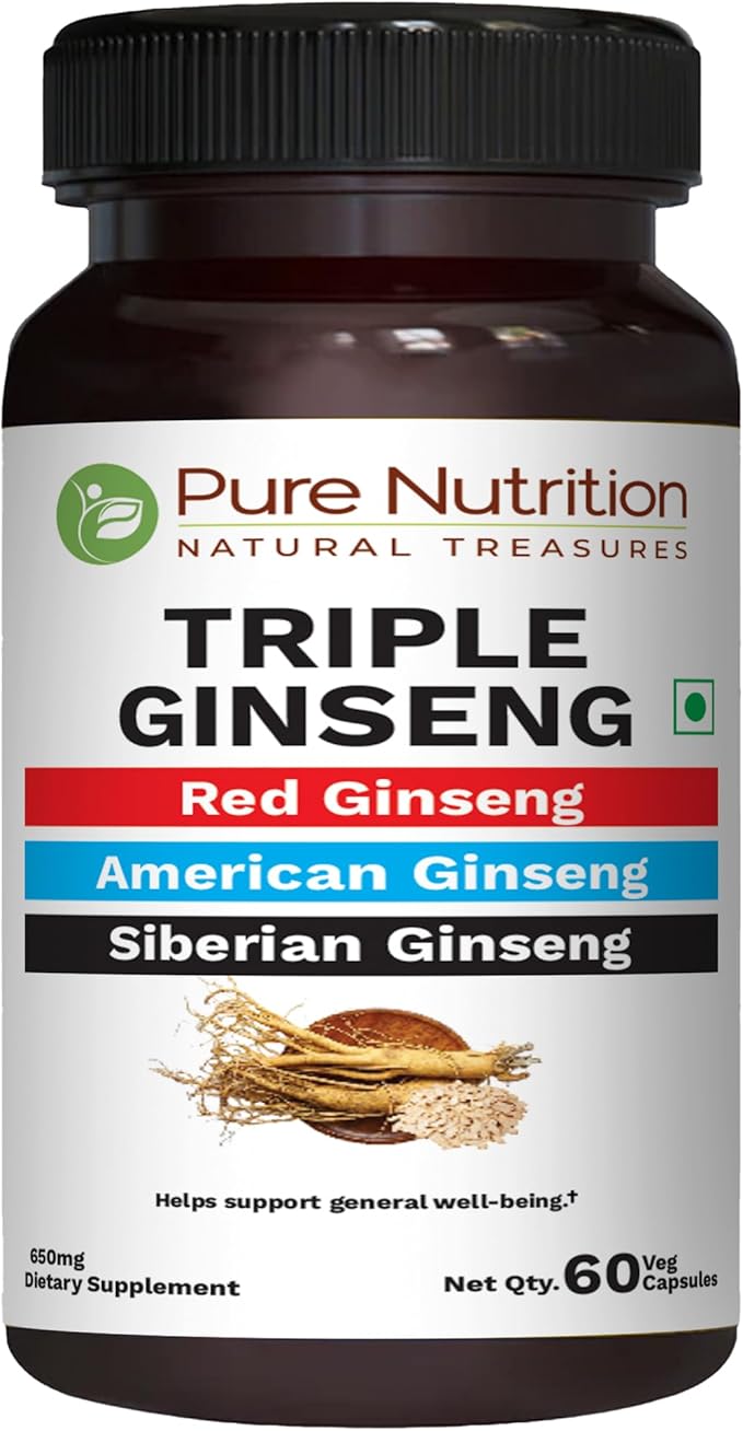 Pure Nutrition Triple Ginseng - an Unique and Effective Combination of Red Ginseng, American Ginseng and Siberian Ginseng. 790mg per Capsule | 60 Veg Caps Pack