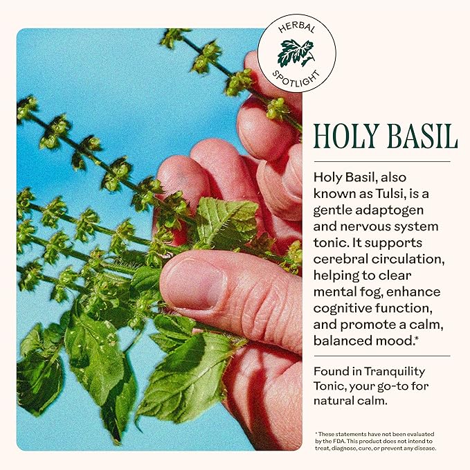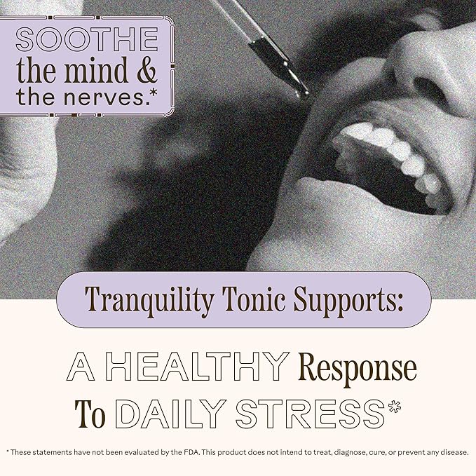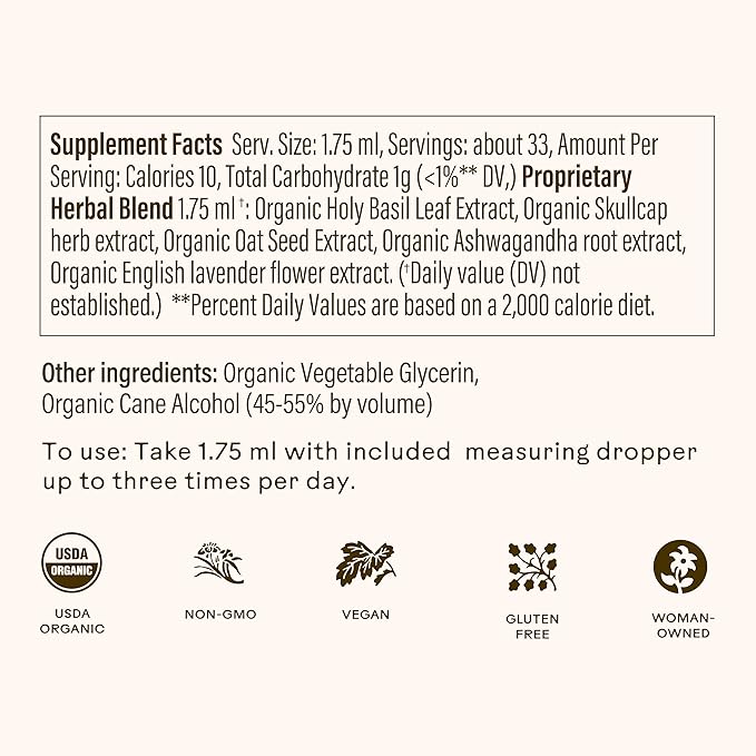 - NATURAL INGREDIENTS: Made with high-quality organic ingredients, including holy basil, skullcap, oat tops, ashwagandha, English lavender, cane alcohol, and water. Our Tranquility Tonic is soy-free, dairy-free, gluten-free, and vegan.