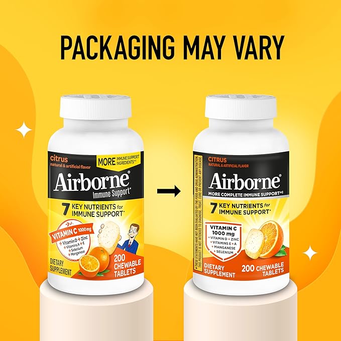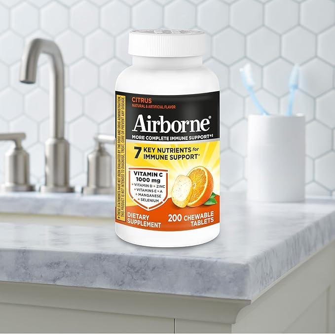 Airborne 1000mg Vitamin C with D and Zinc, Multivitamin Immune Support Supplement with Antioxidants A, C, and E, 200 Chewable Tablets, Citrus Flavor