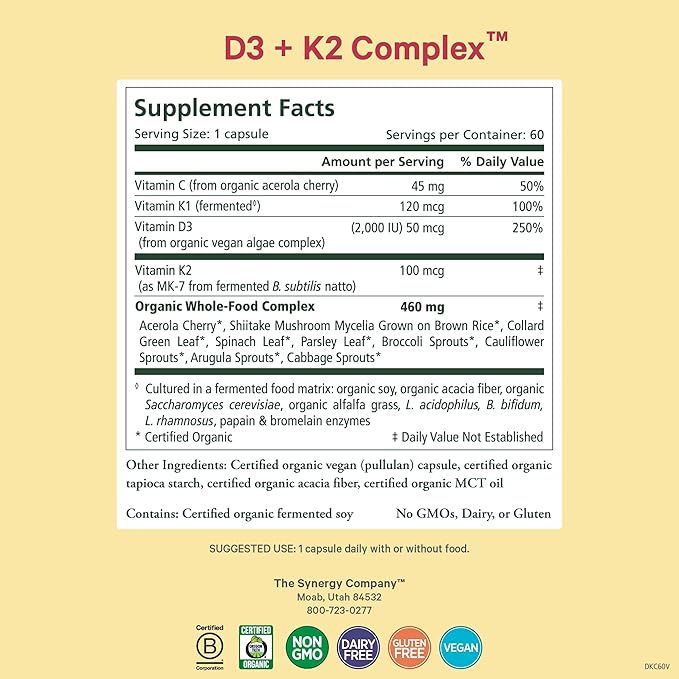 PURE SYNERGY D3 + K2 Complex | Vegan Vitamin D3 K2 Complex | Organic D3 Supplement with Vitamin K2 and K1 Plus Organic Whole Foods | Supports Bone, Brain, and Immune Health (60 Capsules)