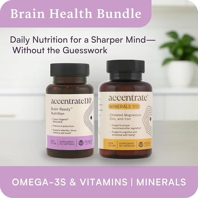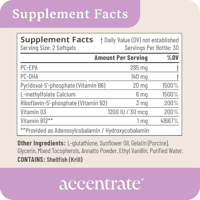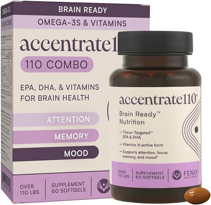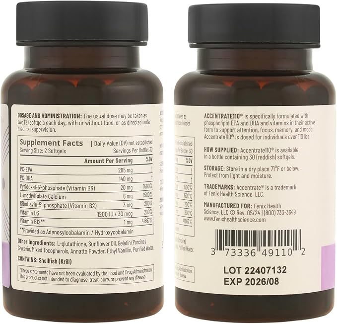 Accentrate110 - Focus Supplement - Methylated Vitamin B Complex with Omega 3 Fatty Acid Supplement - L-Methylfolate, Vitamin B12, P-5-P, Riboflavin, VIT D, – 60 Softgels (1 Month Supply)