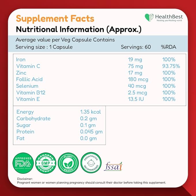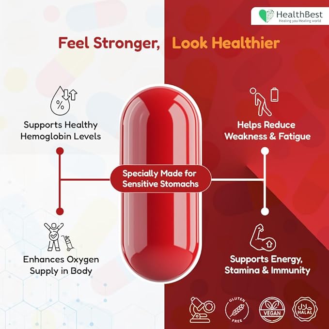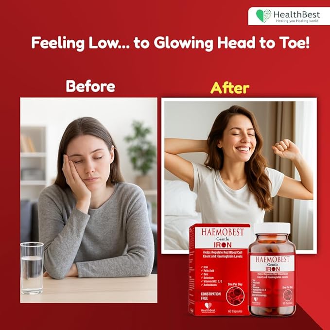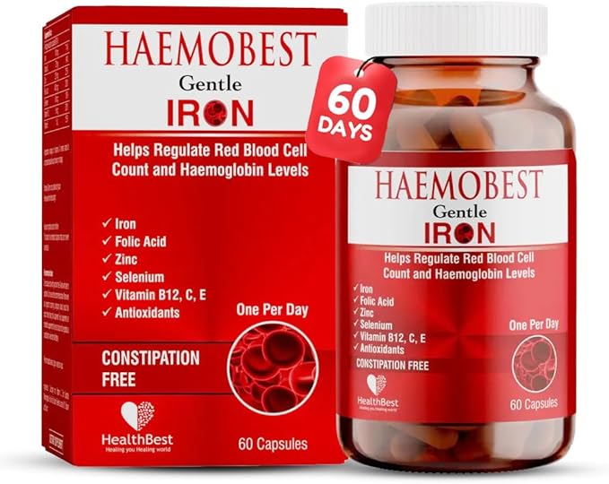 Haemobest Gentle Iron Power Capsules with Vitamin C - 60 Count - Boost Haemoglobin, Gentle on Stomachs - Non-Constipating Formula - Enhances Red Blood Cells Support