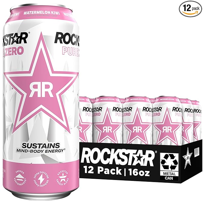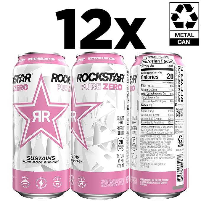 Rockstar Pure Zero Energy Drink,Watermelon Kiwi, 0 Sugar, with Caffeine and Taurine, 16oz Cans (12 Pack) (Packaging May Vary)