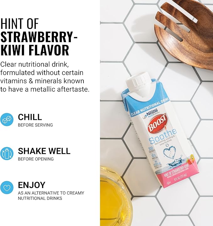 BOOST Soothe Clear Nutritional Drink – Cooling sensation - 300 Calories - 10 g Protein from Whey Protein Isolate - Hint of Strawberry Kiwi Flavor - 8 fl oz (Pack of 24)