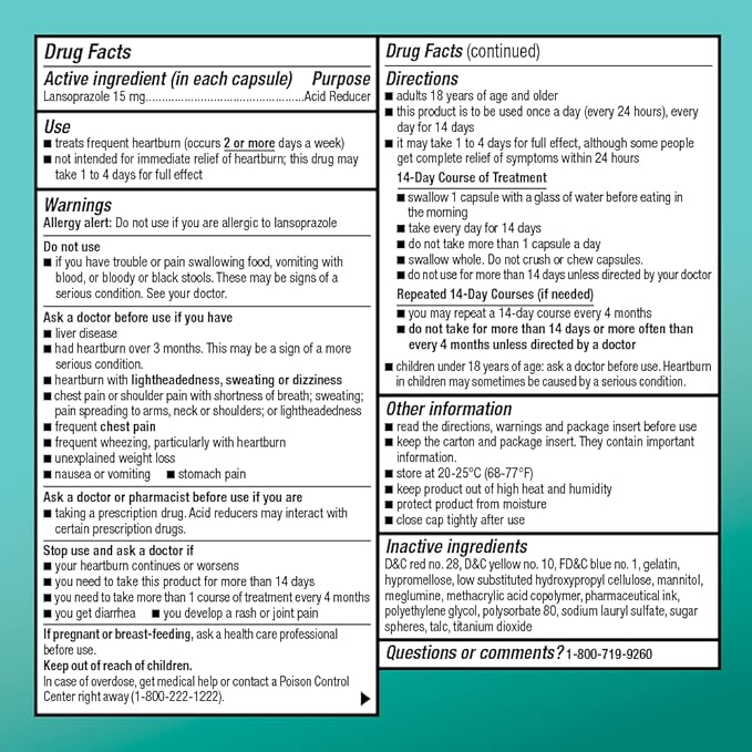 - ACTIVE INGREDIENT: Contains lansoprazole 15 mg, an acid reducer; compare to the active ingredient in Prevacid 24 HR