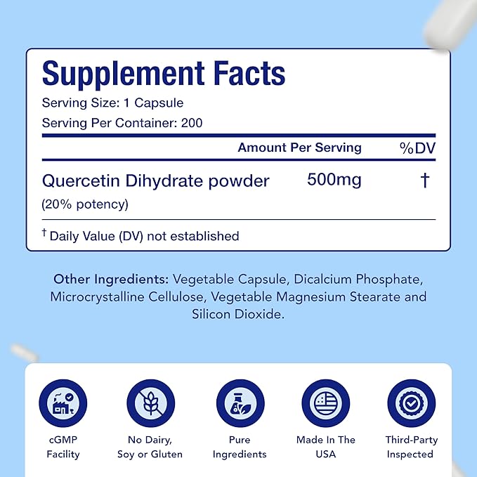 - Made with Love - We make it our mission to provide accessible supplements to all which is why our quercetin is made without artificial flavors and colors, preservatives, corn, dairy, sodium, or soy