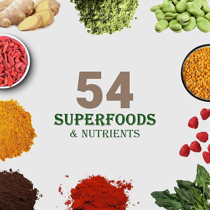- π±π° π¦π¨π£ππ₯ππ’π’ππ¦ ππππ‘π: Containing 54 superfoods, like alfalfa, broccoli, brussels sprouts, kale, black currant, spinach, blueberry, goji berry, raspberry, and seabuckthorn, rich in various vitamins, minerals to supports immune system health