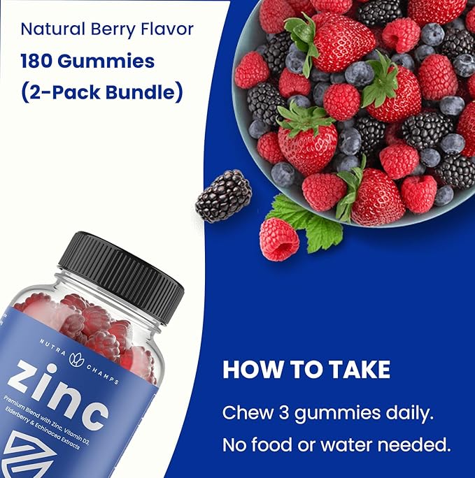 NutraChamps 4-in-1 Zinc Gummies, 50mg Chewable Zinc Supplement Gummies with Vitamin D3 2000 IU, Elderberry & Echinacea, Immune, Heart & Brain Support, 180 Count (Pack of 2)