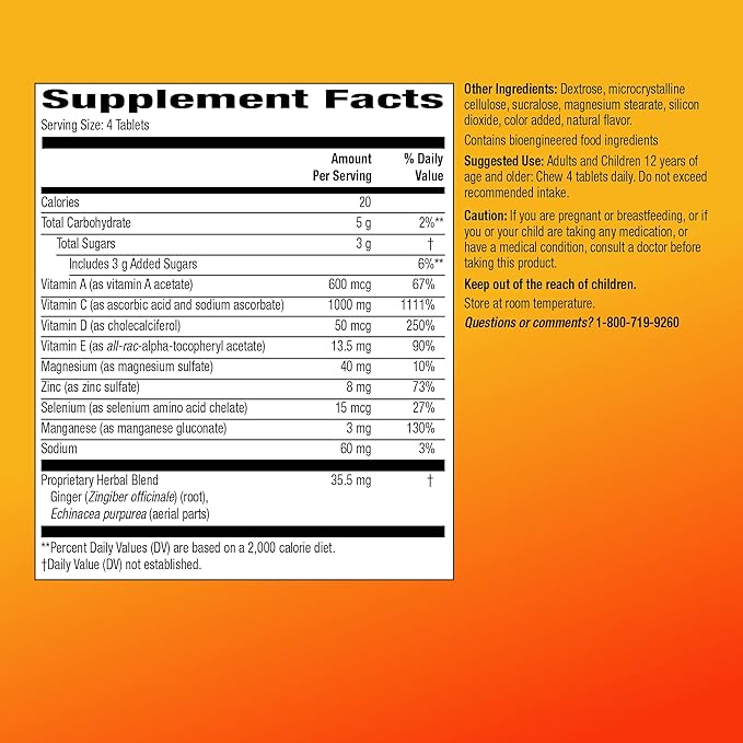 - TEN VITAMINS, MINERALS AND HERBS: Four chewable tablets provide a powerful serving of Vitamin C, Vitamin D, Zinc, Selenium, Antioxidants, Ginger, Echinacea and more; compare to the ingredients in Airborne Chewable Tablets